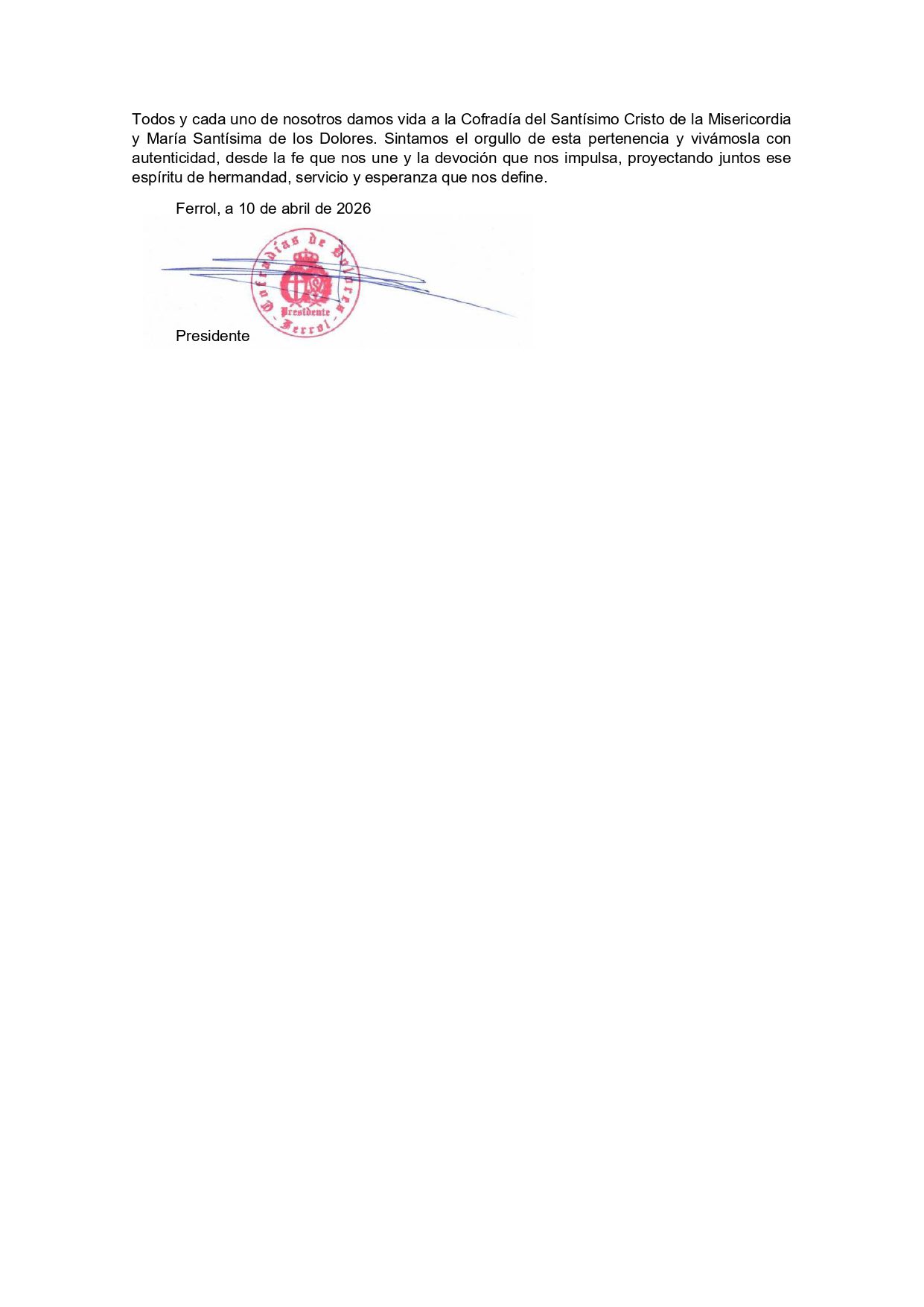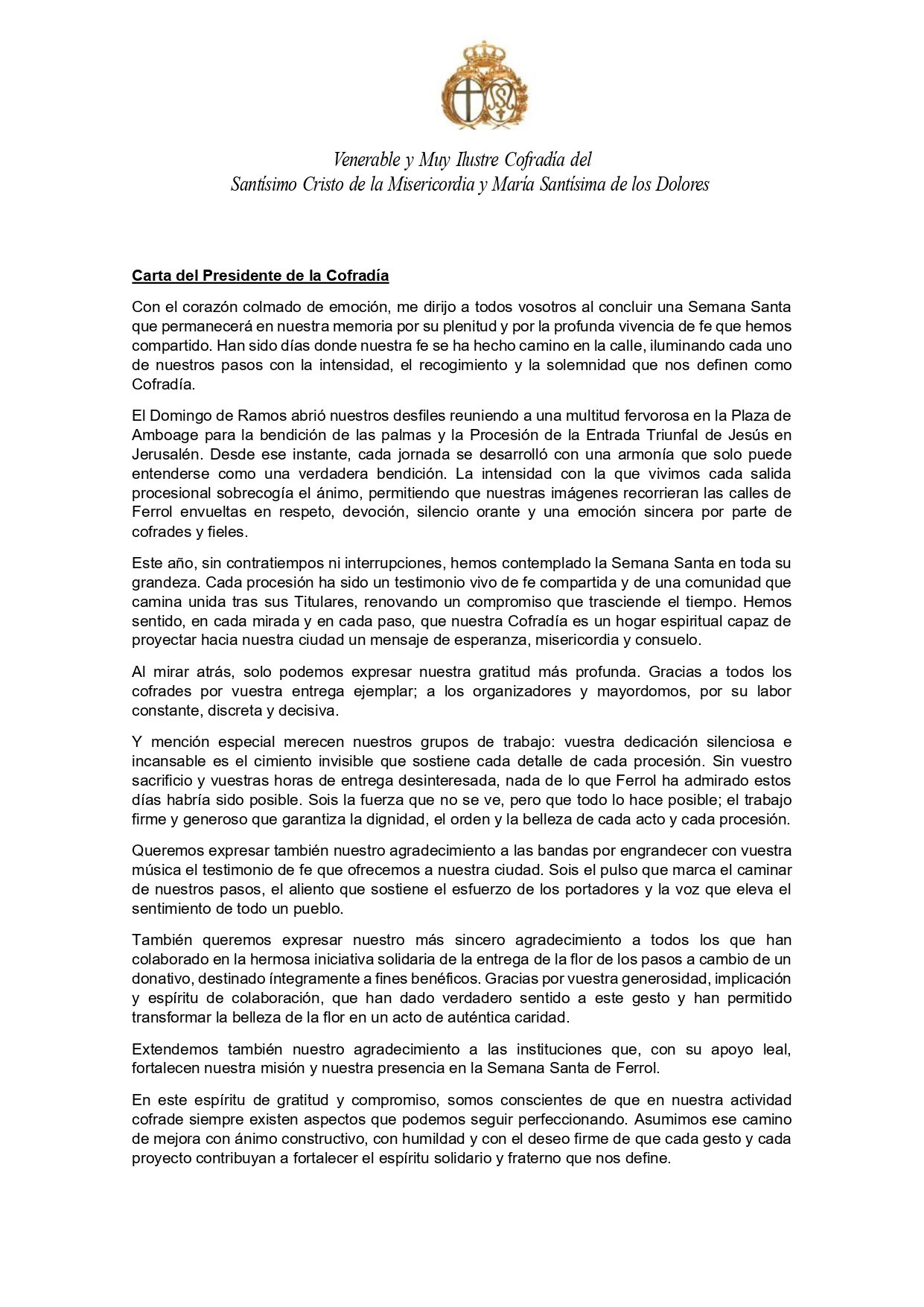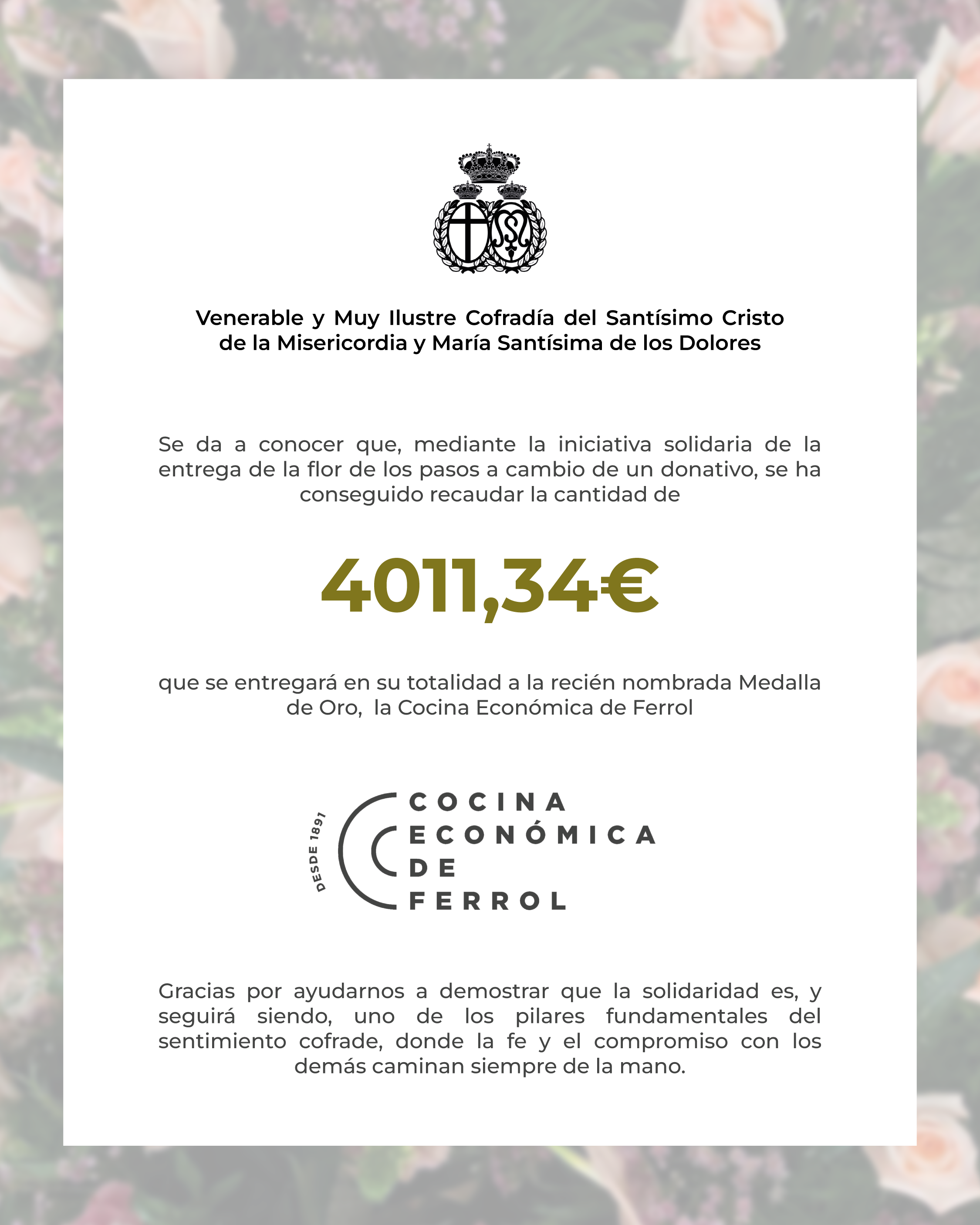 Aprovechamos la ocasión para agradecer, una vez más, esta demostración de solidaridad. La fe y el compromiso con los demás son, y seguirán siendo, pilares fundamentales de la vida cofrade.
