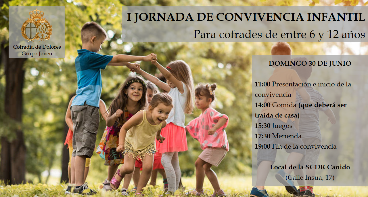 El próximo domingo 30 de junio en el local de la SCDR Canido (calle Insua, 17) el Grupo Joven de la Hermandad celebrará una jornada de convivencia infantil destinada a cofrades de entre 6 y 12 años con el siguiente programa de actividades: